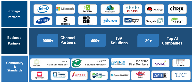 - Наряду с созданием коллабораций с компаниями из списка Fortune 500, включая Cisco, IBM, Microsoft, LG, Ericsson и Diebold Nixdorf, Inspur также организовала стратегическое партнерство с Intel, SAP, VMWARE, NIVIDIA, REDHAT и другими.