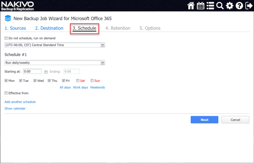Вы можете запланировать автоматическое выполнение заданий резервного копирования Microsoft Office 365 в соответствии с вашей политикой защиты данных, а не запускать их по отдельности. Панель мониторинга календаря позволяет получить четкое представление о ваших заданиях резервного копирования, что позволит оптимизировать окна для резервного копирования, избежать дублирования заданий и снизить потенциальную перегрузку сети.